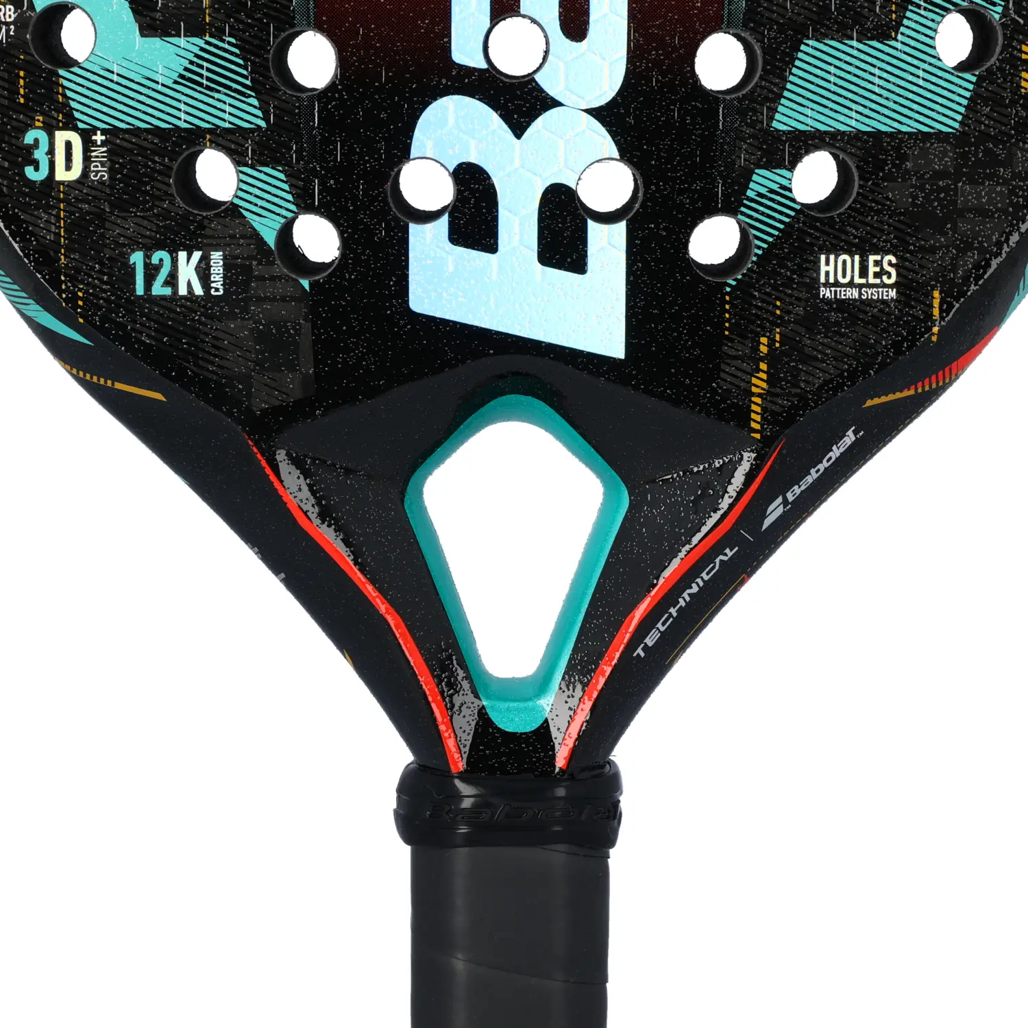 Les trous ont une distribution et une taille optimisées(Holes Pattern System) qui s’adaptent à la forme en diamant de la raquette pour améliorer la transmission de la puissance et obtenir des coups plus précis. De plus, la surface avec relief et rugosité3D SPIN+ vous donne plus de contrôle et d’effets sur la balle.
